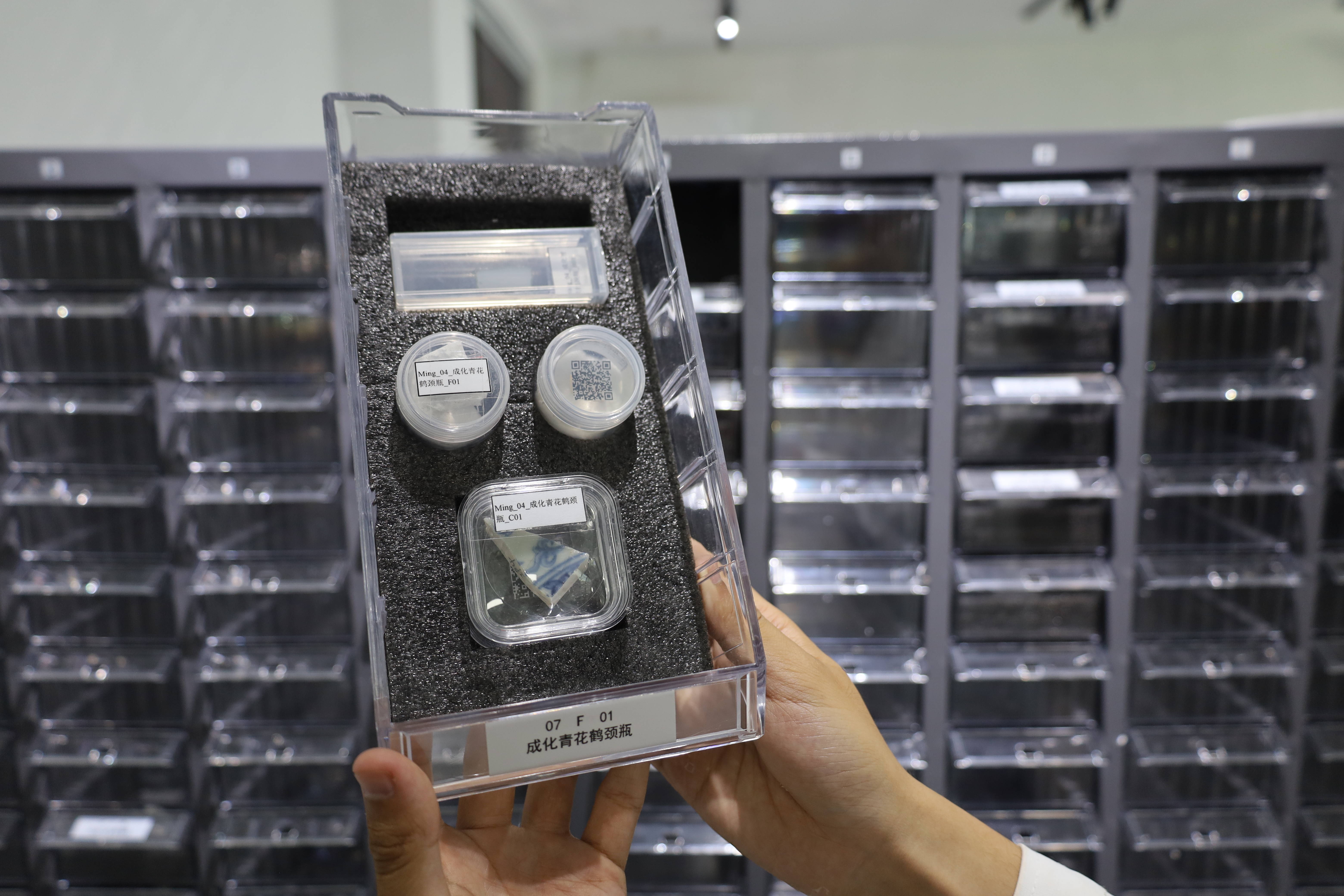 景德镇御窑博物院工作人员展示一份明成化时期的古陶瓷基因标本。(王凯丰 摄)2022年,翁彦俊牵头创立全球首个“古陶瓷基因库”,并联合中国科学院、清华大学、故宫博物院等机构,借助高端设备为瓷片建立起详尽的“DNA档案”。釉色、胎土、配方均被转化为可解析的数据。